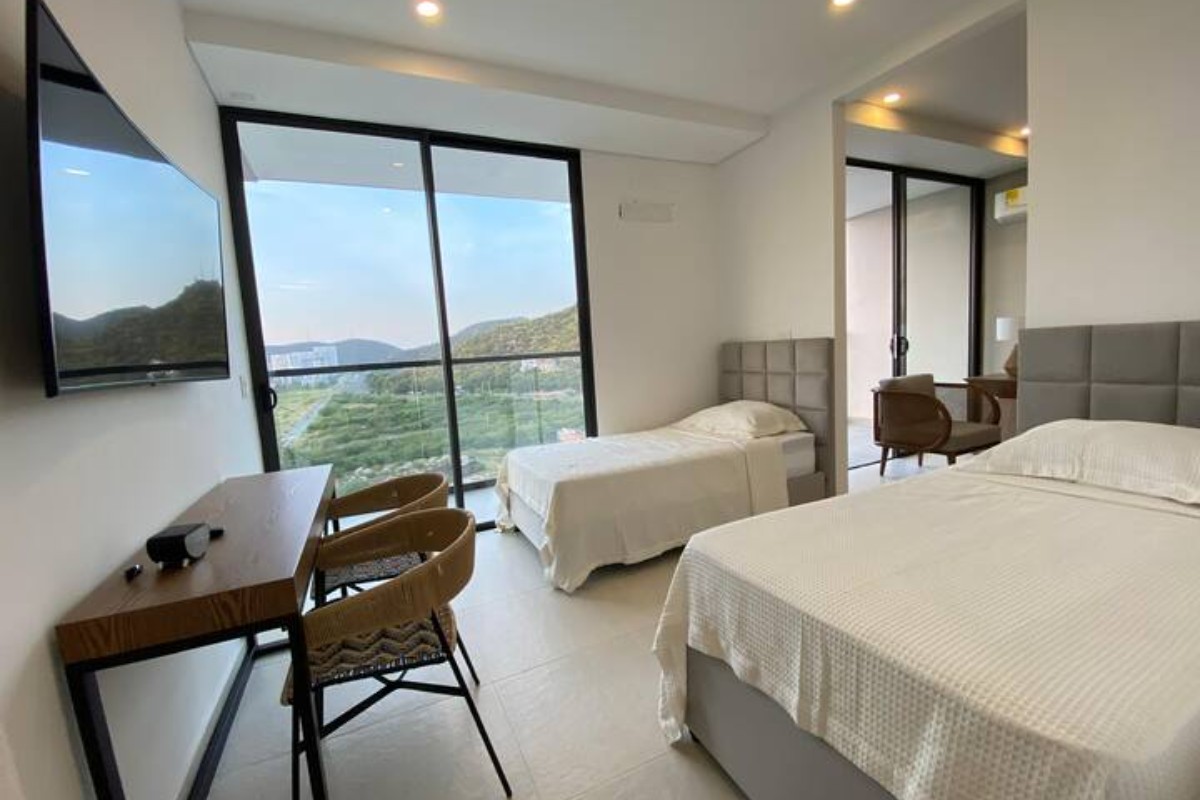 En un exclusivo apartamento de 70 metros cuadrados construidos mmás 8 mts cuadrados de terraza. Ubicado en una zona residencial y campestre, encontrarás un espacio moderno y amoblado con 2 habitaciones y 2 baños. Disfruta de la iluminación natural, cocina equipada con isla y vista panorámica desde el balcón y a 150 mts de la plaza. Además, cuenta con jacuzzi, aire acondicionado, gas natural y vigilancia privada 24/7. El edificio ofrece piscina, sauna, zonas verdes, ascensores inteligentes y acceso para discapacitados. Ideal para familias, con zona infantil, salón comunal y parqueadero.